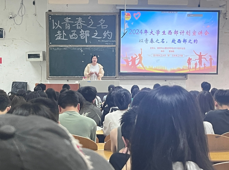 首先,播放西部计划宣传片,通过展示西部计划志愿者的奋斗历程和成长经历宣传片让同学们对西部计划的项目内容、报考条件等有了初步的了解,引导同学们树立正确的职业观和就业观。随后,2023年毕业于我校学前教育专业的陈东和曹海艳进行了分享。他们分别服务于自贡市贡井区建设镇人民政府经济发展办公室和贡井区成佳镇党政办公室。陈东从西部计划志愿者的亲身经历,重点介绍了西部计划的笔试、面试内容,并鼓励同学们积极报名西部计划,将小我融入大我之中,积极投身基层服务。随后曹海艳分享了她参加西部计划的工作情况,以及参与西部计划的收获与成长。活动最后设置了问答环节,同学们积极提问,老师和优秀校友们耐心解答,现场气氛十分活跃。