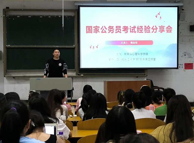 为帮助我院学子增加对公务员考试的了解,进一步明确自身职业规划,掌握备考技巧,提升应试能力,由教育与心理科学学院主办、“职”引未来工作室承办的国家公务员考试经验分享会于4月18日下午在汇南校区厚德楼315教室进行。本次分享会由体育学院2019级优秀毕业生梅如松主讲,教心学院学工办副主任、团委副书记徐文婷主持,学院100余名学生参加了本次活动。