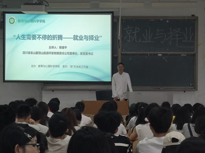 陈建平校友2012年毕业于我校应用心理学专业,现任四川省名山蒙顶山旅游开发有限责任公司董事长、党支部书记。他从自身案例、选择的重要性、工作的意义三个方面为同学们讲解了关于如何选择就业方向,评估职业定位,制定职业规划,以及将所学知识应用于实践等方面的经验和建议。陈建平以自身经历为例,分享了自己求学、入伍、从政、经商.......一路的“折腾”,但正是这些“折腾”造就了他坚韧不拔的性格。他说道:“有时候,选择比努力重要,但是重要的不是你选择了什么,而是你做出选择之后,如何坚定地走下去。”他强调,同学们在就业和择业之间,要学会做选择并保持执行力,鼓励同学们要做自己人生的主人,莫负时光,用有限的生命做无限的事,书写自己灿烂的人生篇章。