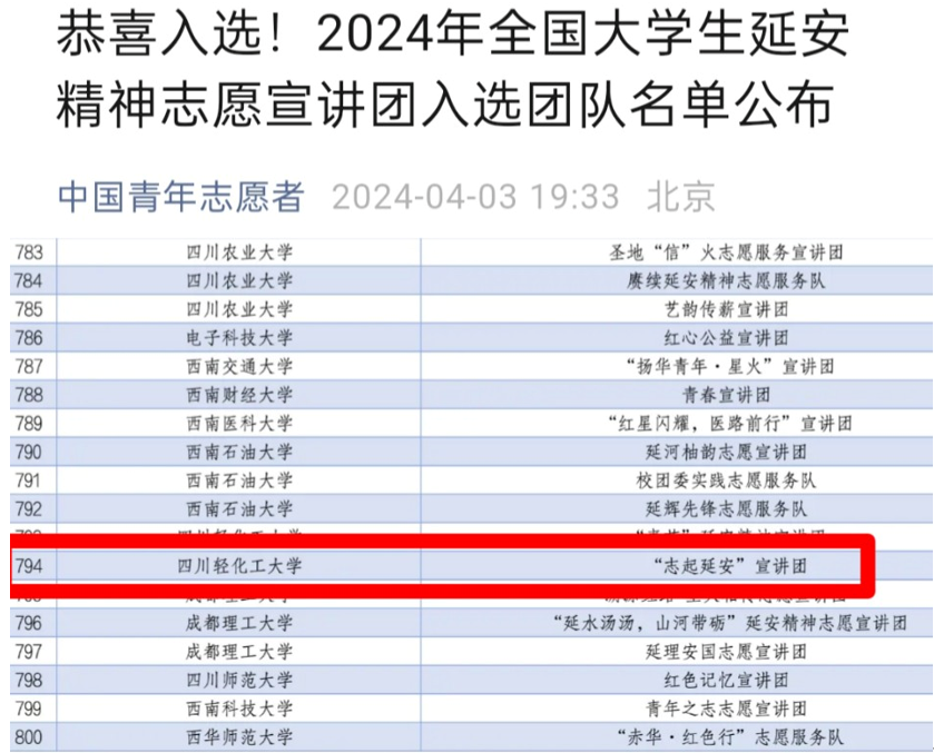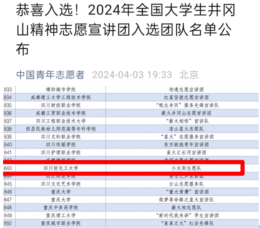 为深入学习宣传贯彻习近平新时代中国特色社会主义思想和党的二十大精神,落实“强国复兴有我”群众性主题宣传教育活动相关要求,引导动员青年学生大力弘扬井冈山精神、延安精神、雷锋精神、西柏坡精神,团中央青年志愿者行动指导中心联合有关单位,开展弘扬中国共产党人精神谱系志愿宣讲活动,面向全国高校遴选大学生志愿宣讲团队,小太阳志愿队成功入选“2024年全国大学生延安精神志愿宣讲团”“2024年全国大学生井冈山精神志愿宣讲团”“2024年雷锋精神服务团”“2024年全国大学生西柏坡精神志愿宣讲团”。