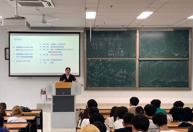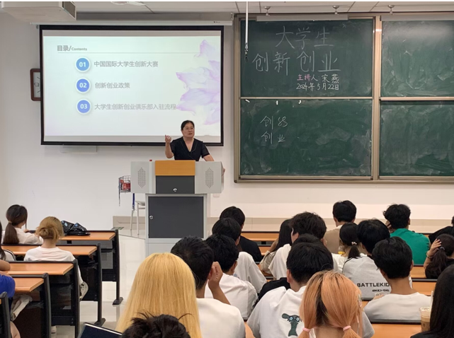 活动伊始,宋老师向同学们分享了大学生创新大赛的参赛、复赛和总决赛的时间,各类别赛道的内容以及赛道评分制度。她指出,不同类型的项目各有其独特的特点和要求,同学们应根据自身的兴趣和能力,选择适合自己的项目进行申报。随后,宋老师从创新创业的支持政策出发向学生介绍了学生可以通过创新创业项目平台获得的创新基金支持力度以及创新创业俱乐部的入驻流程。最后宋老师勉励大家,创业虽然对于大学生来说是一件很有风险且需要谨慎思考的事情,但创新却可以让大家学会很多更广泛的思考方式和方法,她鼓励大家要创新求异,勇于改变,跟上时代的快节奏。