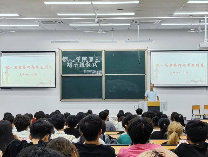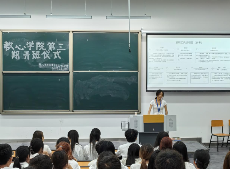 为进一步加强入团积极分子对共青团的认识,教育与心理科学学院于2024年6月1日晚上在李白河校区H1S124教室举办第三期团校培训班开班仪式暨开班第一讲。教心学院党委书记杜鑫担任授课主讲人,教心学院学工办辅导员钟翔担任本次开班仪式主持人。