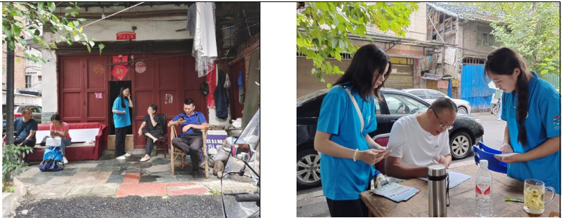 在绵绵细雨初停的午后,心育同行团队成员们整装待发,身着统一的志愿服务服装,携带精心设计的问卷调查表和心理健康宣传单,分赴百花亭社区、小桥子街、桂园林社区等地,开启了一场紧张而富有意义的调研工作。