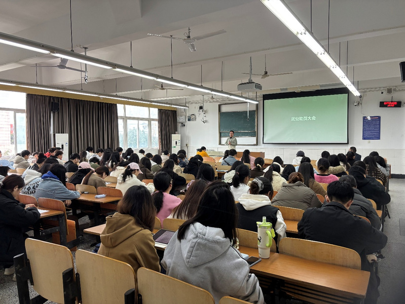 第三环节为就业动员。辅导员文洋老师围绕当前就业形势、就业政策与流程为同学们进行了清晰的梳理和解读。他详细介绍了毕业生就业信息系统的使用、三方协议的签订流程与注意事项、档案转接等关键事务,解答了同学们普遍关心的诸多实际问题。随后,学院谢晓辉书记发表了充满关怀与力量的就业动员讲话。谢书记鼓励同学们要认清形势、坚定信心、明确目标、主动出击,将个人理想融入国家社会发展大局,以积极的姿态迎接社会的挑选,并预祝全体同学前程似锦。