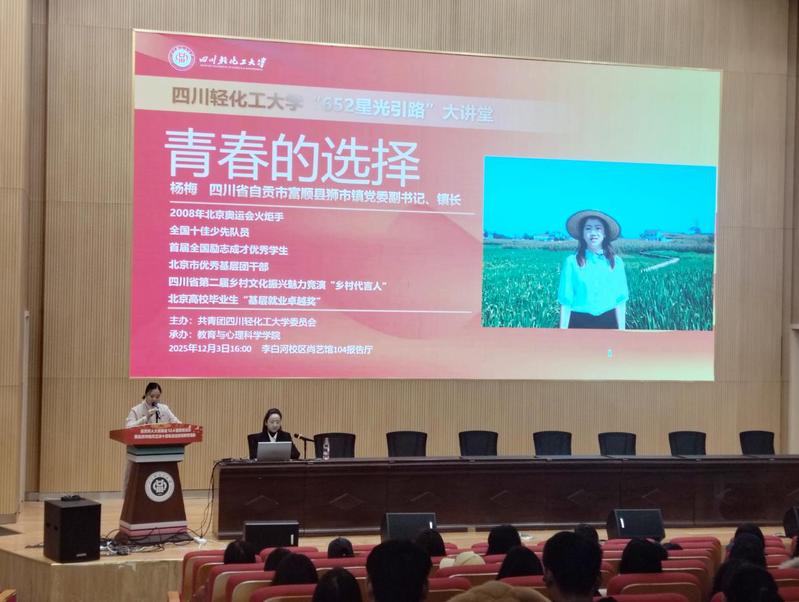 为引导青年学生明确青春方向、勇担时代使命,以榜样力量激发奋斗精神,2025年12月3日下午,由共青团四川轻化工大学委员会主办、教育与心理科学学院承办的“青春的选择”主题演讲活动,在李白河校区尚艺馆104报告厅顺利举行。本次活动特邀四川省自贡市富顺县狮市镇党委副书记、镇长杨梅担任主讲嘉宾。