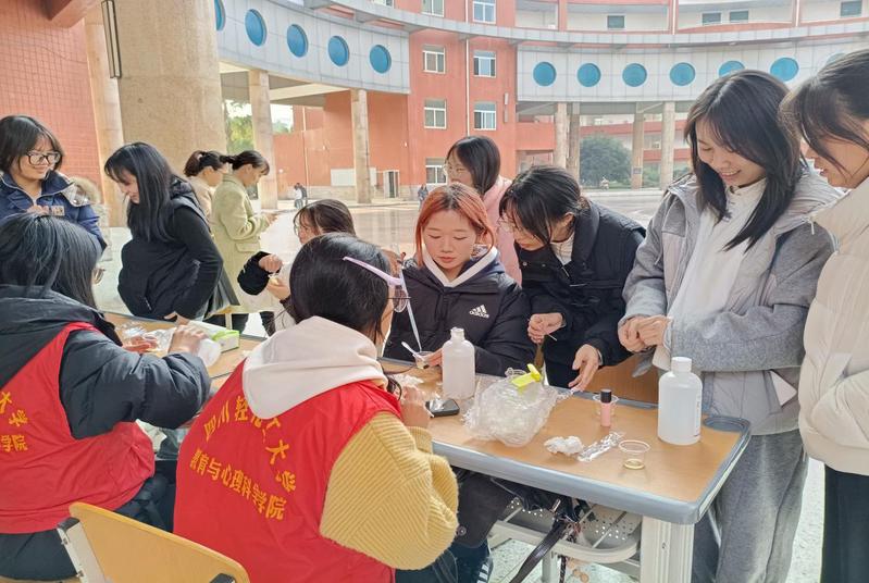 为缓解学生在期末阶段面临的学业压力与社交焦虑,培育理性平和、积极向上的健康心态,2025年12月10日下午,四川轻化工大学教育与心理科学学院在汇南校区喷泉广场举办“12·5”心理健康主题教育活动。本次活动面向全校师生,通过一系列沉浸式体验环节,引导同学们关注自我、悦纳当下,营造温暖积极的校园心理氛围。